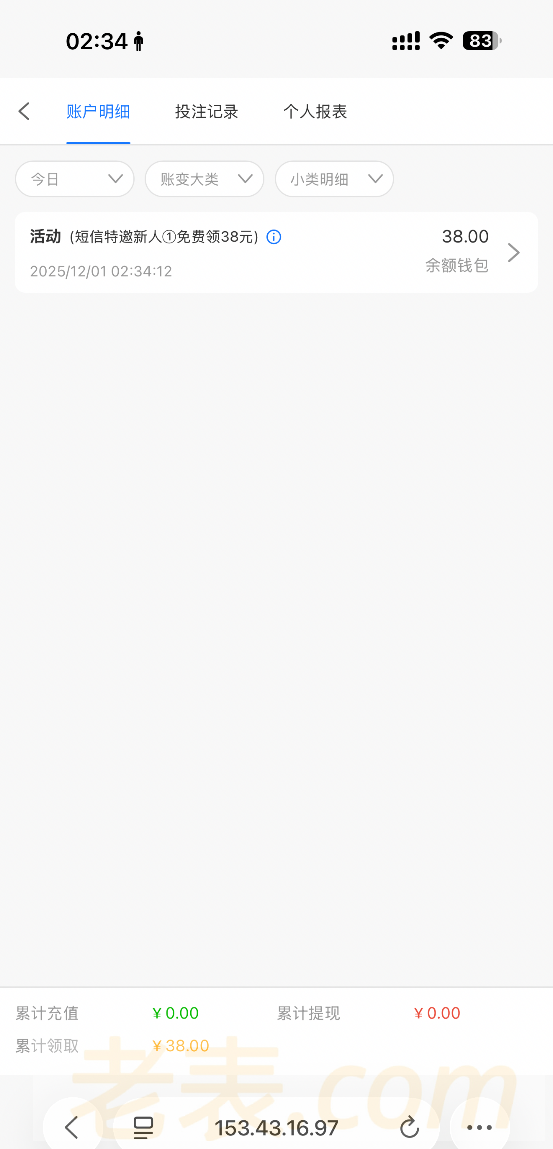 注册了去发短信就送38 出款未知没打,发完信息两分钟就到账打出来了,发下图