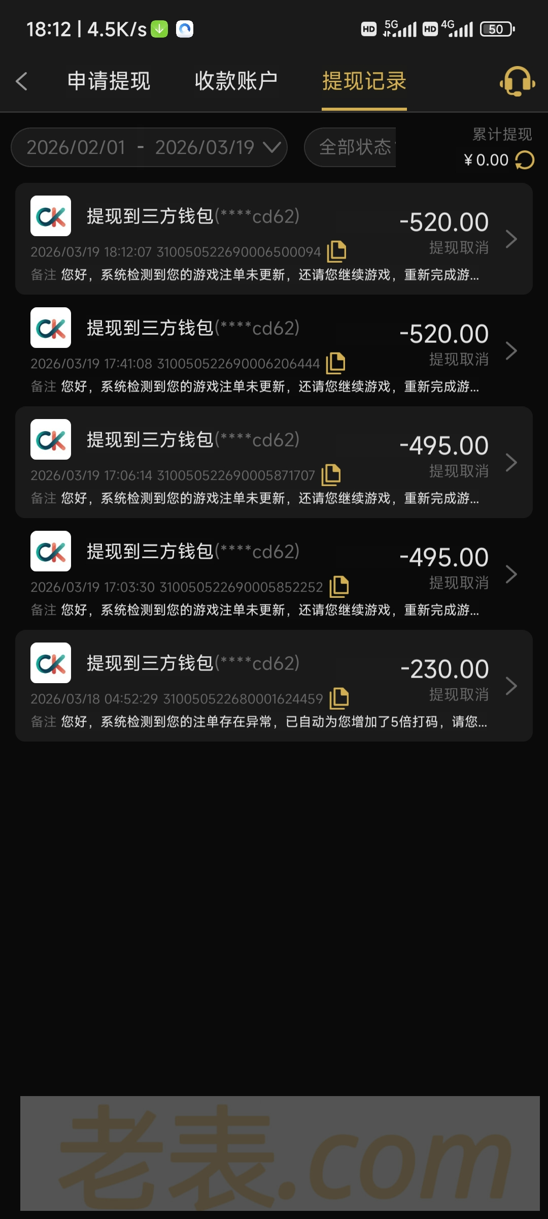 充值300提500打了3000流水,提现都是直接秒取消,只进不出黑台注意。